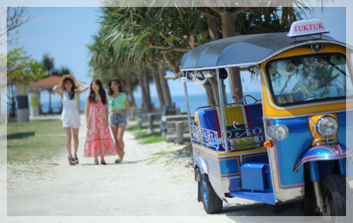 紺碧の海を眺めながら、恩納村の名所を東南アジアの交通手段でおなじみのトゥクトゥクでのんびり走ってみませんか。普通免許があれば運転できます。