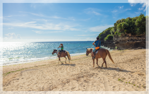 読谷村では、沖縄では珍しい乗馬体験ができます。青い海原を眺めながら草原をゆっくりミニビーチまで散策してみてはいかがですか。