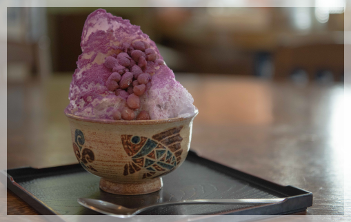 座喜味城跡(ざきみじょうせき)の門前にある「鶴亀堂ぜんざい」は、季節を問わず沖縄ぜんざいが楽しめる人気店。シャリッと軽くなめらかなかき氷の中から、6時間以上煮込んだ金時豆と白玉だんごが顔を出します。一番人気の「紅芋黒糖ぜんざい」は、黒糖生姜のシロップがアクセントに。沖縄の牧場で作られた紅芋アイスを合わせると、沖縄らしさ満点です。