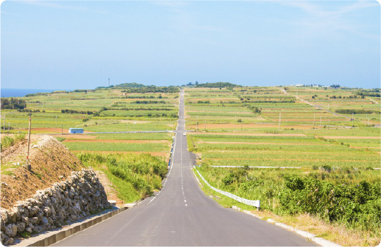 まるで青い空と海に続いているように見える、およそ2.5km続くサトウキビ畑の一本道。映画やテレビのロケ地としても利用されている人気スポットです。