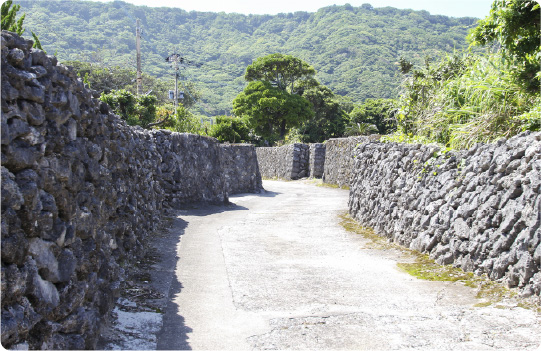 土地の境界線を示し、台風から家を守る役割も果たしたサンゴ石垣は島のそこかしこで見ることができますが、阿伝集落は特に多くのサンゴ石垣が残っています。人と自然の共存の歴史を感じられる場所です。