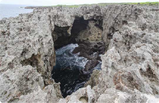 広がる岩場は、隆起したサンゴが風や雨で削られてできたもので、島の成り立ちを感じられます。駐車場から歩いてすぐ見られ、天気や波の高さによって景色が変わるのも魅力です。