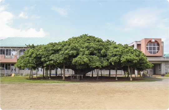 国頭小学校の校庭にある、森のように広がる巨大なガジュマル。面積・規模ともに国内最大級とされ、120年を超える樹齢を誇っています。