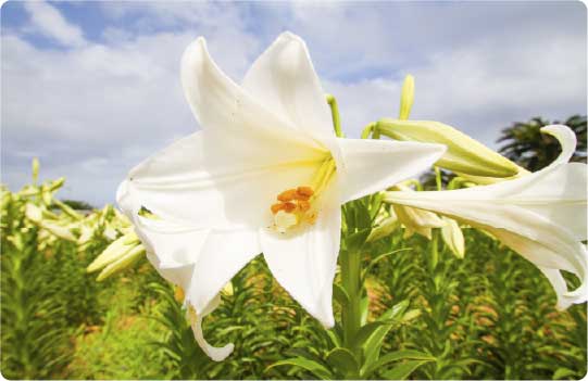 沖永良部島を代表する花、エラブユリは、真っ白で大きな花を咲かせるユリの品種です。