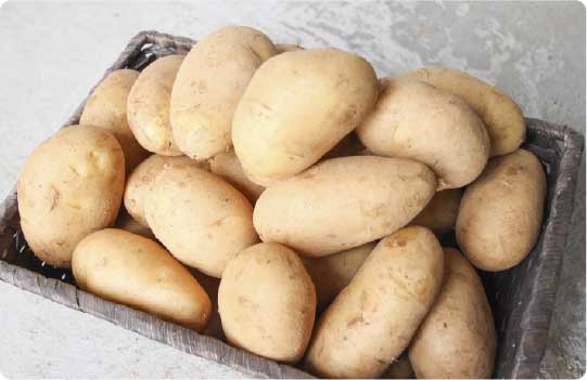 ミネラル豊富な赤土で育った島のじゃがいも「春のささやき」は、全国に先駆けて収穫される新じゃがです。収穫は2月〜4月ごろ。甘みと粘りが特徴で、生ならシャキシャキ、揚げるとふわふわ、蒸すとホクホクに。