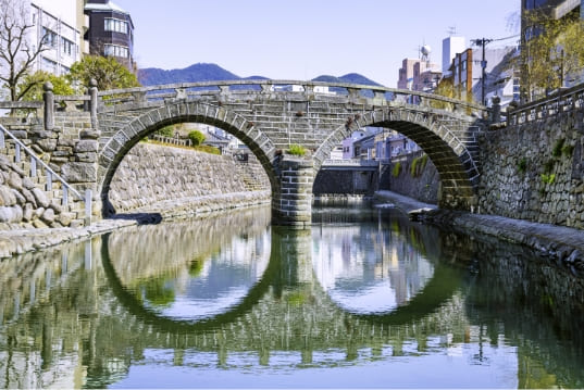 日本最古の石造りアーチ橋として知られる「眼鏡橋」。川面に映る姿が“眼鏡”のように見える美しい名所です。周囲の石畳の街並みを散策しながら、長崎の歴史と情緒をゆったり感じられるスポットです。