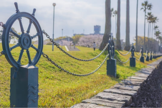 広々とした園内は散歩やピクニックにぴったりで、地元の人々にも愛される憩いのスポットです。そばには廃ガラス再生砂を用いて造成した浅場「ガラスの砂浜」があります。自然の中でゆったり過ごしたい方におすすめです。