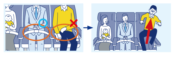- 空席があればすぐに座り、シートベルトを締める