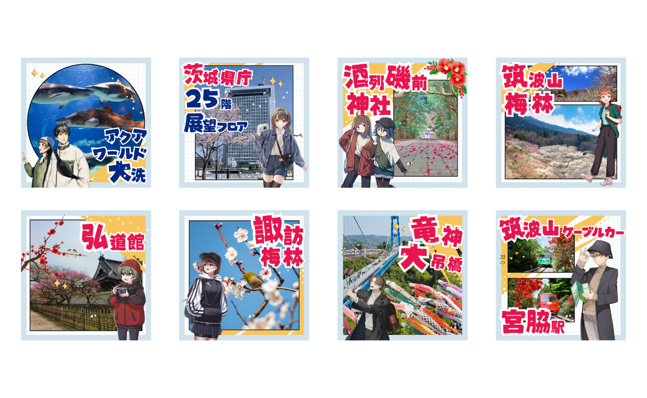 茨城県内の観光地を中心とした対象施設スポットでは、株式会社代々木アニメーション学院イラスト科の学生様が制作したイラストを含むデジタルスタンプを取得できます。