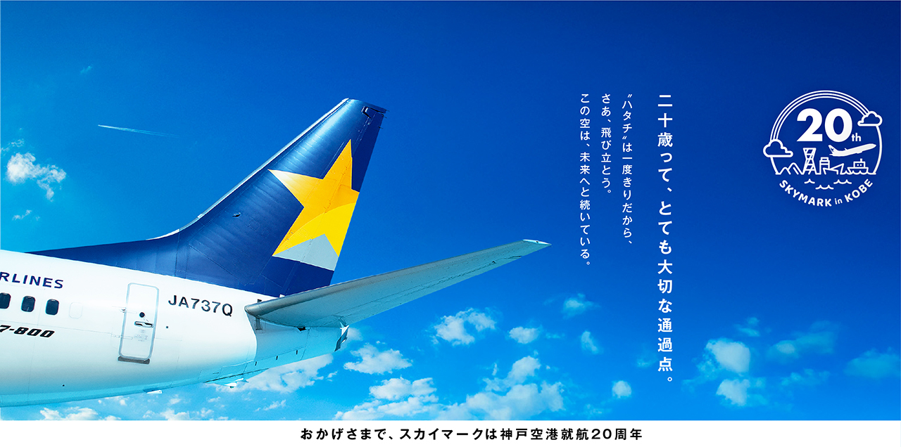 スカイマークは、神戸空港の開港とともに歩み、大きな節目である就航20周年を迎えました。 当社の「西の拠点」として、共に歩んだこの20年は、私どもにとってかけがえのない財産です。今日までの道のりを支えてくださったお客様、地元の皆様、そして神戸市や関西エアポート様をはじめとするご関係の皆様のご支援に、厚く御礼申し上げます。私どもはこれからも、確かな安全の上に成り立つ快適な空の旅をご提供し、地域の発展に真摯に貢献してまいります。これからも変わらぬご厚情を賜りますよう、心よりお願い申し上げます。