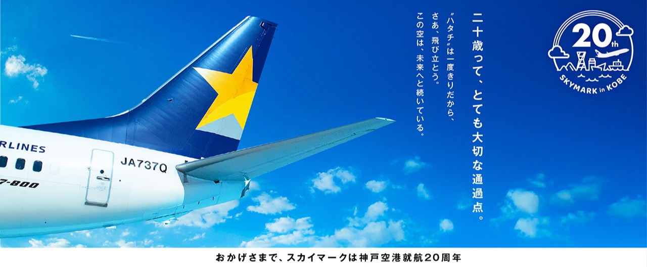 神戸空港就航20周年特設サイトにて、スカイマークと神戸空港の20年の歩みを振り返るスペシャルインタビューや、神戸の空の旅を楽しんでいただくための社員の「想い」を公開しております。スカイマーク神戸空港就航20周年特設サイト:https://www.skymark.co.jp/ja/campaign/kobe20th_anniversary/